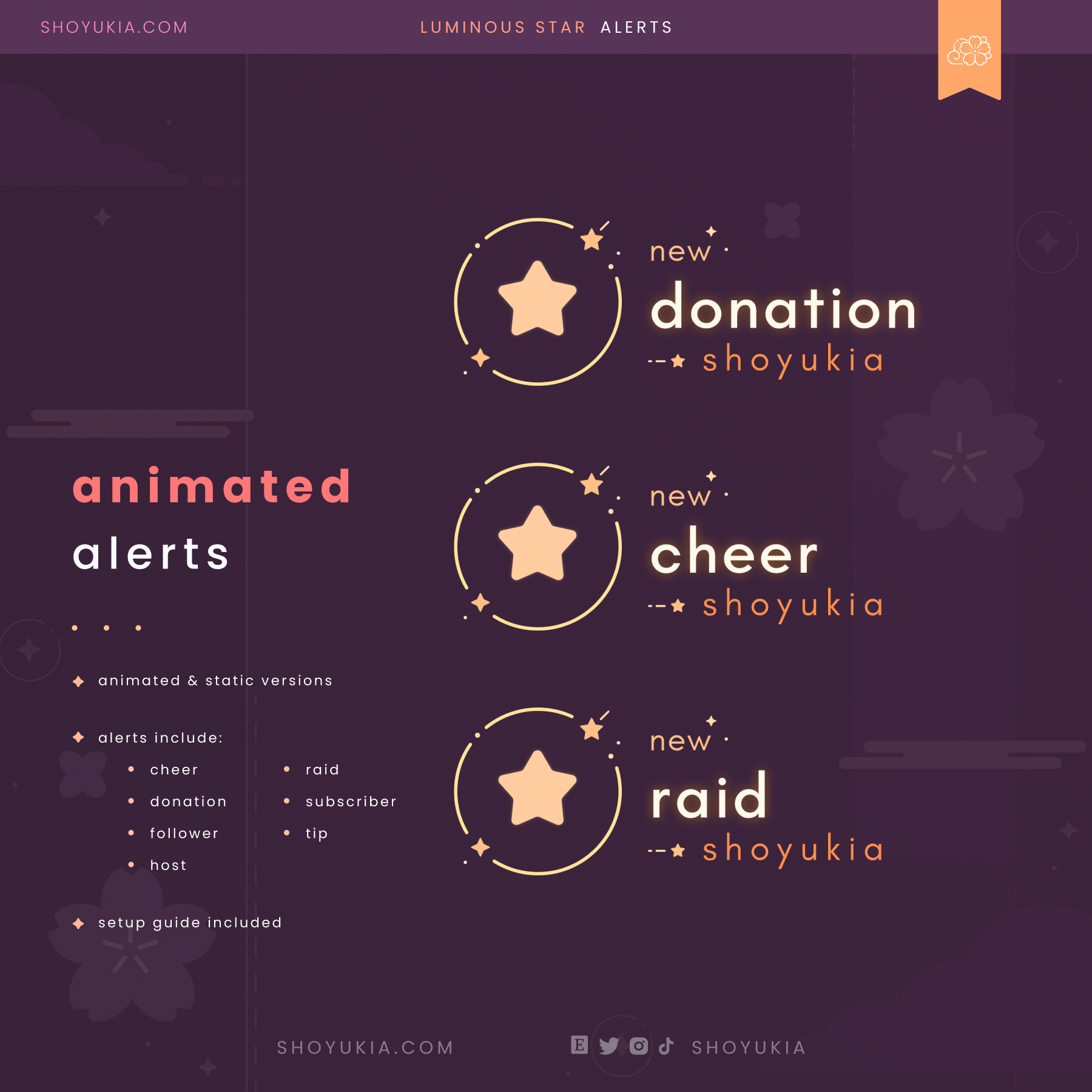 → 7 Animated & Static Alerts (cheer, donation, follower, host, raid, subscriber, tip)